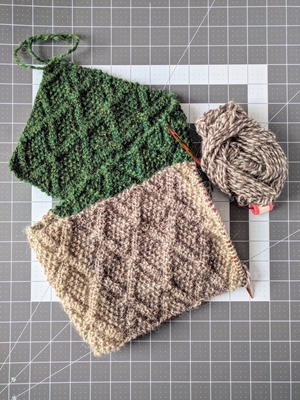 The diamonds are drastically more obvious in this photo than in real life! Must be the contrast. This Mosa Mjúkull wool is reasonably fuzzy so you don’t get a lot of stitch definition. I found that a little disappointing at first, but I’m sure it will look better after blocking - hopefully more like the picture!