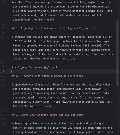 Many years later I took up sewing and knitting, and discovered the online craft communities that still wrote blogs about it. When I started my own blog about it, I went to Wordpress. I stayed on Wordpress for 8 years. Eventually, when on a career break, I migrated to a self-hosted version of Wordpress so I could do more advanced things. I wrote myself a gallery plugin in PHP (and found it tremendously frustrating working with Wordpress’s tooling). This was when the itch began to make my place on the web more mine, and take it back to something simpler that wasn’t all composed of somebody else’s bloated platform and frameworks. And then I learned about the Indie Web. And here we are.