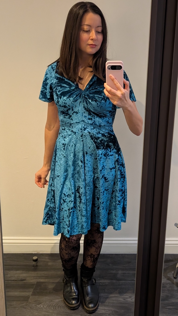 Teal Velour Joni DressProject detailsTagssewingtilly and the buttonsCompletedDecember 2025PatternJoniDesignerTilly and the ButtonsMaterialsYarn/FabricTeal stretch velour from Bombay Fabrics (Knitting and Stitching Show)⬅ Previous projectRed Satin S3099 DressNext project ⮕Dark Teal Kielo Wrap Dress